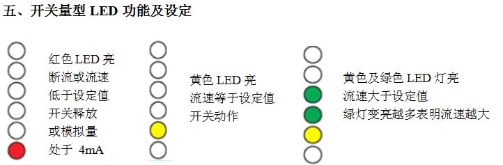 將流開(kāi)關(guān)裝好,使介質(zhì)以需要監(jiān)測(cè)的流速流動(dòng),擰開(kāi)面板上的螺絲,調(diào)整電位計(jì), 使第一個(gè)綠色LED怡好變亮。此后當(dāng)流速低于當(dāng)前值時(shí),開(kāi)關(guān)就釋放(紅燈亮)。若要使開(kāi)關(guān)點(diǎn)比當(dāng)前流速小,可調(diào)整電位計(jì)(順時(shí)針旋轉(zhuǎn)螺絲刀)使綠色 LED多亮一些。
