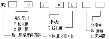 例1:WZPD-2×10×60-3D-0-Pt100表示:電機(jī)用鉑電阻溫度傳感器、本體尺寸2×10×60mm,3根引線,每根引線長(zhǎng)度2000mm,引線屏蔽,分度號(hào)為Pt100。